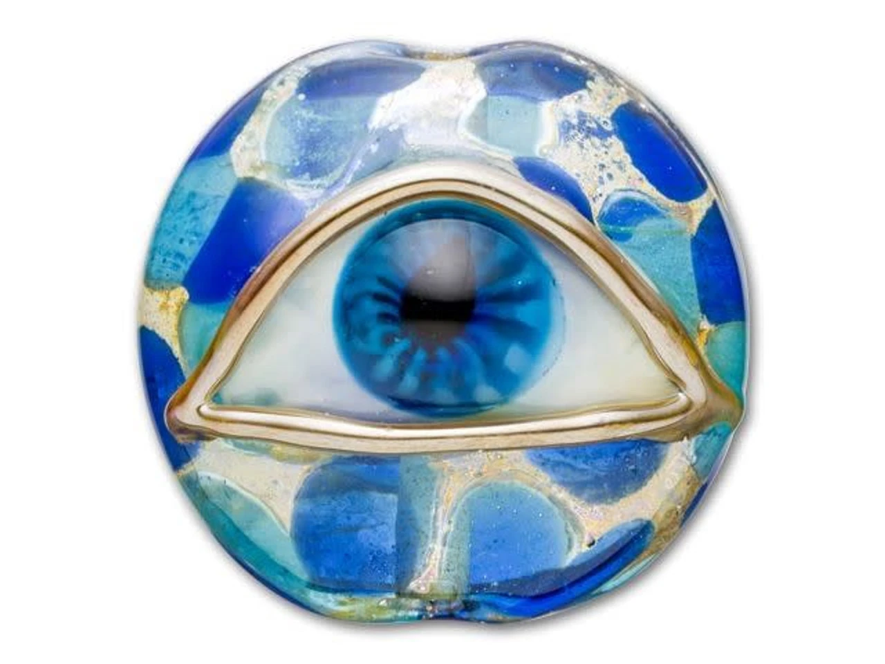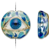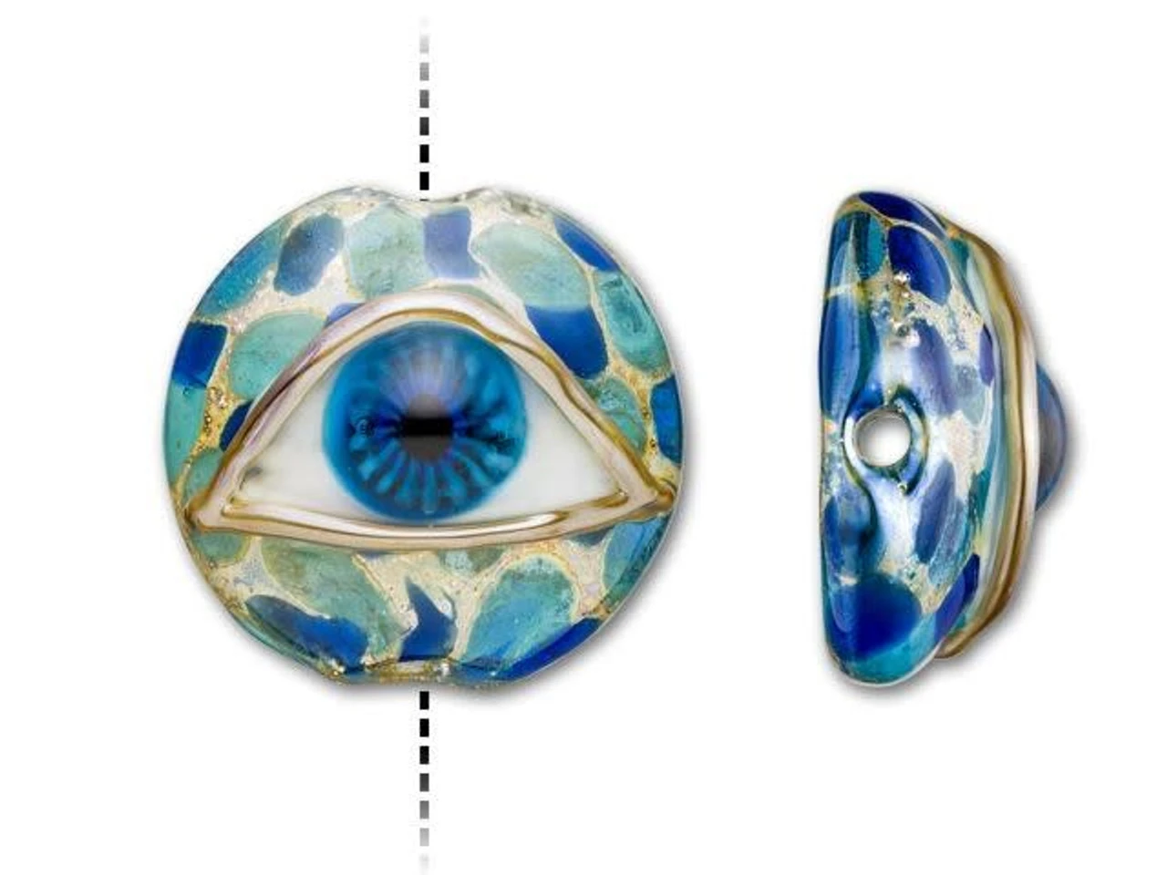 Create an eye-catching design with the Grace Lampwork blue eyed focal bead. This circular bead features a domed front so the intricate design will stand out even more. The back is flat so it will rest comfortably in designs. You can even use this bead as a focal in bead embroidery. String it onto a head pin to turn it into a quick pendant. This bead features a raised design of a detailed eyeball. The eye features deep blue color, while the background it rests on displays aqua, blue and gold colors. It would make a beautiful focal for evil eye jewelry.This item is handmade, so appearances may vary. Length 24mm, Width 25mm
