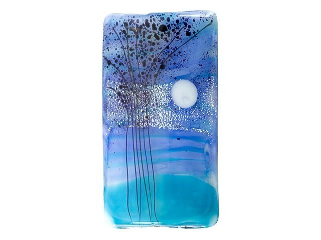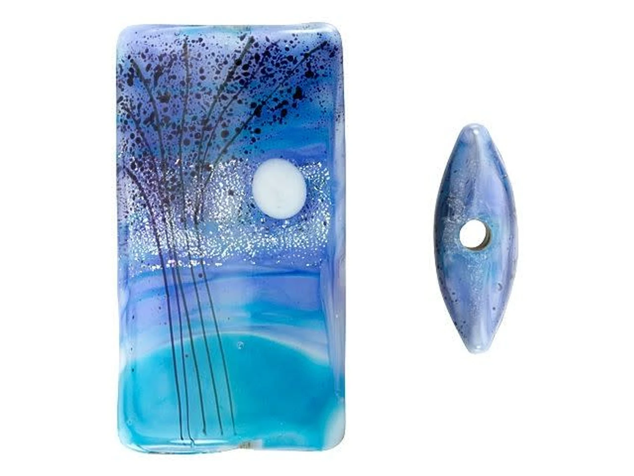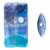 Showcase twilight beauty in your designs with this Grace Lampwork bead. This bead features a rectangular shape and a puffed dimension that will stand out in your jewelry designs. Both sides are decorated with a scene of tall trees and a full moon on a swirling blue background. Silver glitter adds to the magic. Showcase this bead in a stringing project, dangle it from a head pin for a quick pendant, and more. It will make a bold statement anywhere. This item is handmade, so appearances may vary.