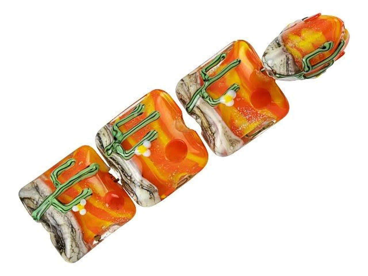 Go for a Southwest look with these Grace Lampwork beads. These beads feature a square pillow shape with a puffed dimension, so they will stand out in your jewelry designs. Both sides of each bead are decorated with a green cactus in the desert with a sunset red sun and orange and yellow sky in the background. Showcase these beads in necklaces, bracelets, or even earrings. You’ll love using them in your designs. This item is handmade, so appearances may vary.