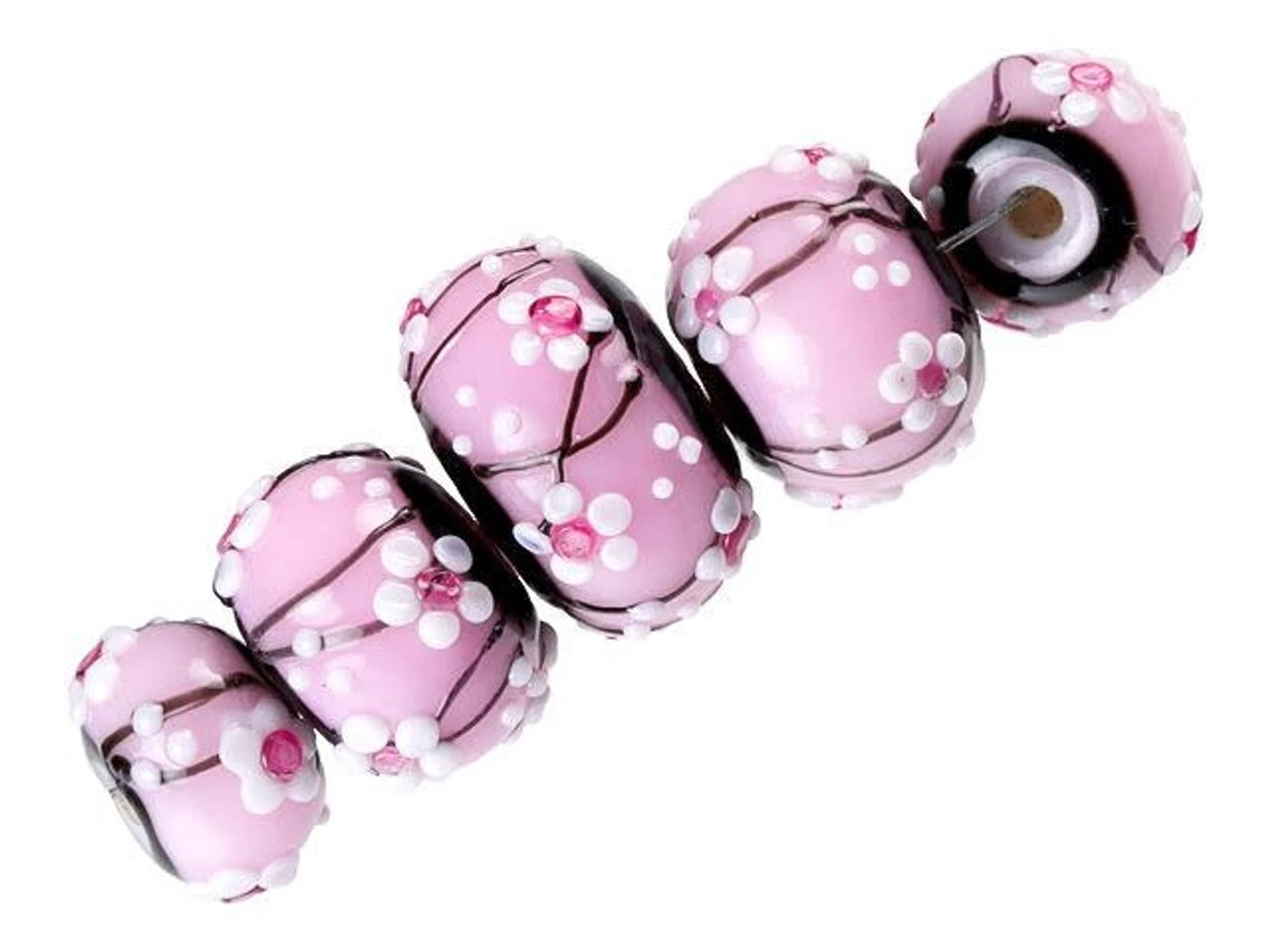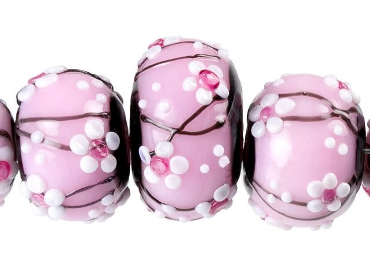 An elegant display can be yours with these Grace Lampwork beads. These five glass beads are graduated in size and feature raised cherry blossom designs on a pale pink background. Cherry blossoms are exquisite flowers that you’ll want to showcase in your jewelry designs. Use these beads together in a necklace or bracelet. They would look wonderful with spring green or sky blue colors.This item is handmade, so appearances may vary. Diameter 9-12mm, Length 9-12mm