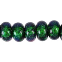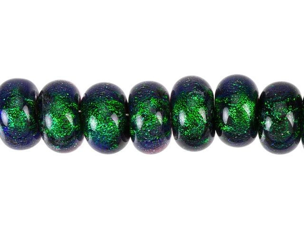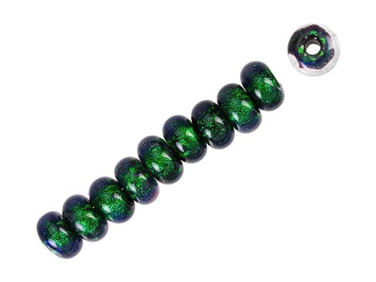 Mysterious glitter creates an enchanting display in these Grace Lampwork beads. These beads display a deep green color that glitters from within. Pair it with dark purple for a captivating display, or try it with gold for a truly luxurious look. These beads feature a classic roundel shape that will work in a variety of styles. Try them as spacers in necklaces and bracelets or make them the focal of an earring design. These beads are available by the strand, giving you ten beautiful beads to work with.This item is handmade, so appearances may vary. Diameter 9.5-10mm, Length 5.5-6mm
