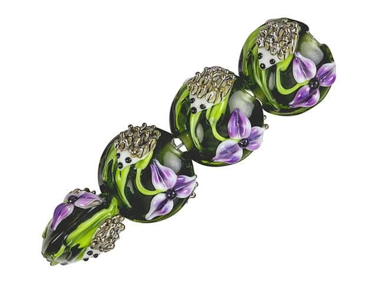 It’s easy to create cute style with these Grace Lampwork beads. These beads are round in shape and feature a slightly puffed dimension. Each bead features a raised design of a tiny hedgehog with a purple iris flower on a black background. This design is featured on both sides of each bead, so it will look great from any angle. Use these beads in necklaces, bracelets, or earrings for cute critter style. This item is handmade, so appearances may vary.