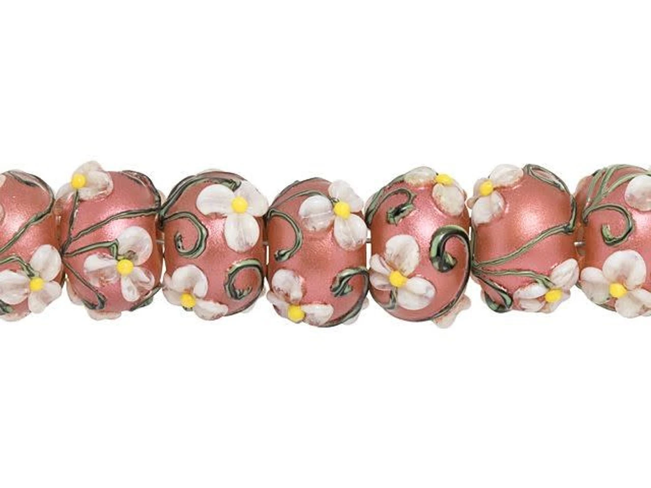 Floral fun fills these Grace Lampwork beads. These beads feature a classic rounded shape and display a raised design of white flowers with swirling green vines on a shimmering sunset coral pink background. They’re perfect for spring and summers tyles. Use them together in jewelry sets, or showcase them as dangles on head pins. They feature wider stringing holes, so you can use them with thicker stringing materials, like Silk Ribbon. This item is handmade, so appearances may vary.