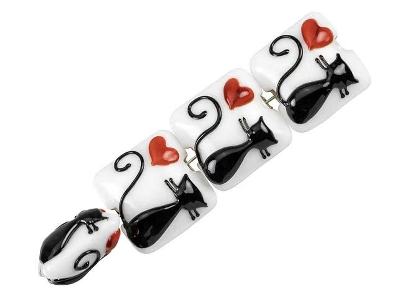 Feline fashion starts with these Grace Lampwork beads. These beads feature a square pillow shape with a puffed dimension, so they will stand out in your jewelry designs. Both sides of each bead are decorated with a black cat silhouette with a red heart on a creamy white background. You can showcase these beads in necklaces, bracelets, or even earrings. They are perfect for any cat lover. This item is handmade, so appearances may vary.