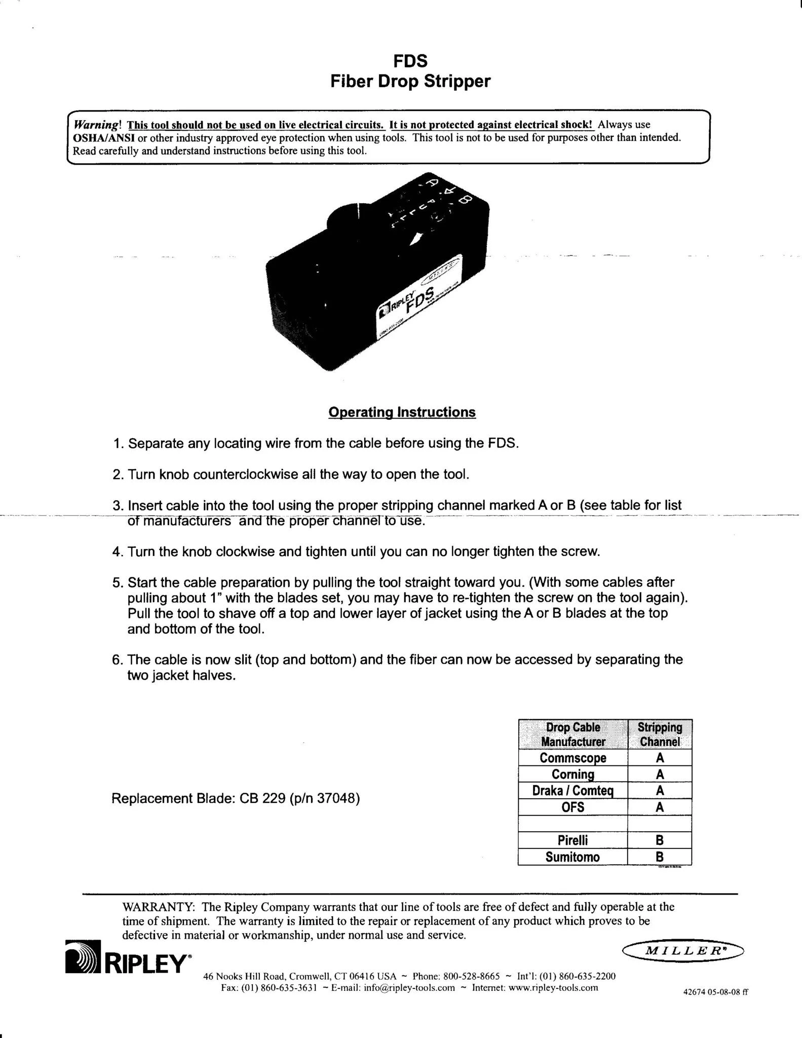 MILLER FDS FIBER DROP STRIPPER. Designed for stripping flat drop cable used in Fiber to the Home applications. Tool removes the jacket in two locations to expose the dielectric strength members and allowing quick removal of the jacket.