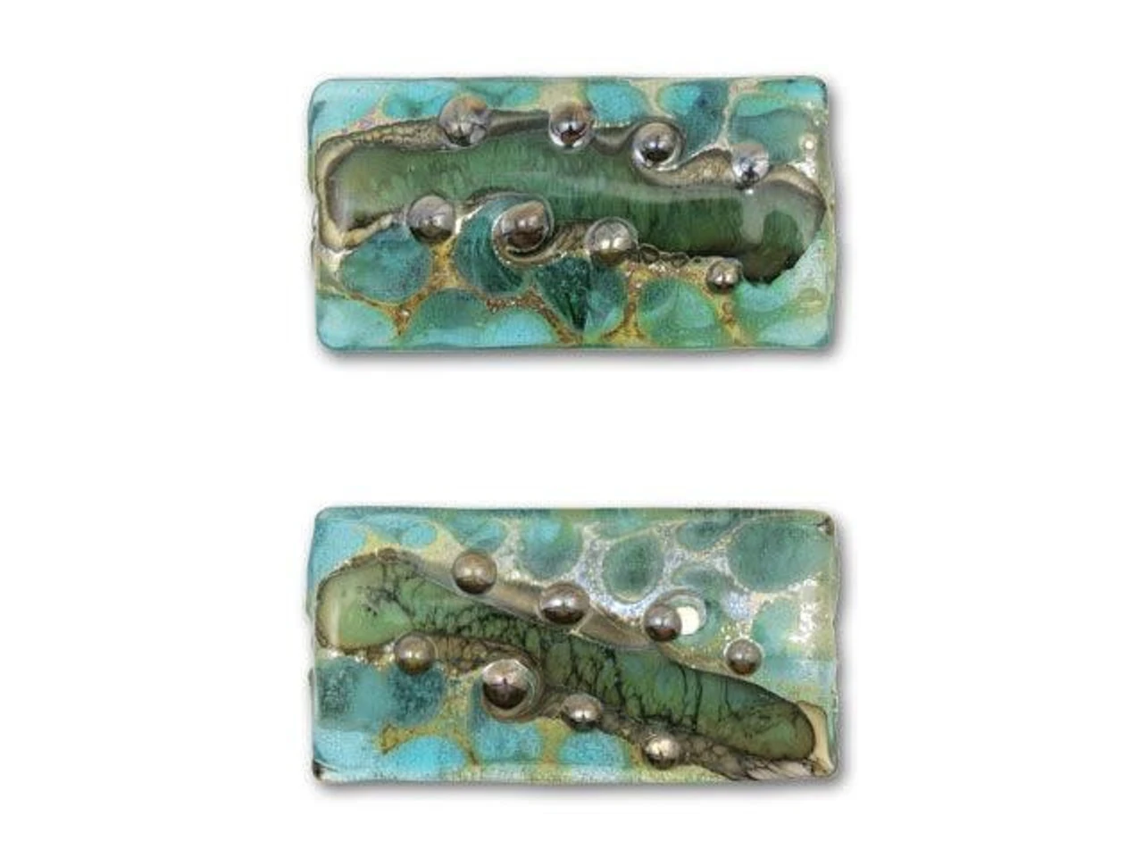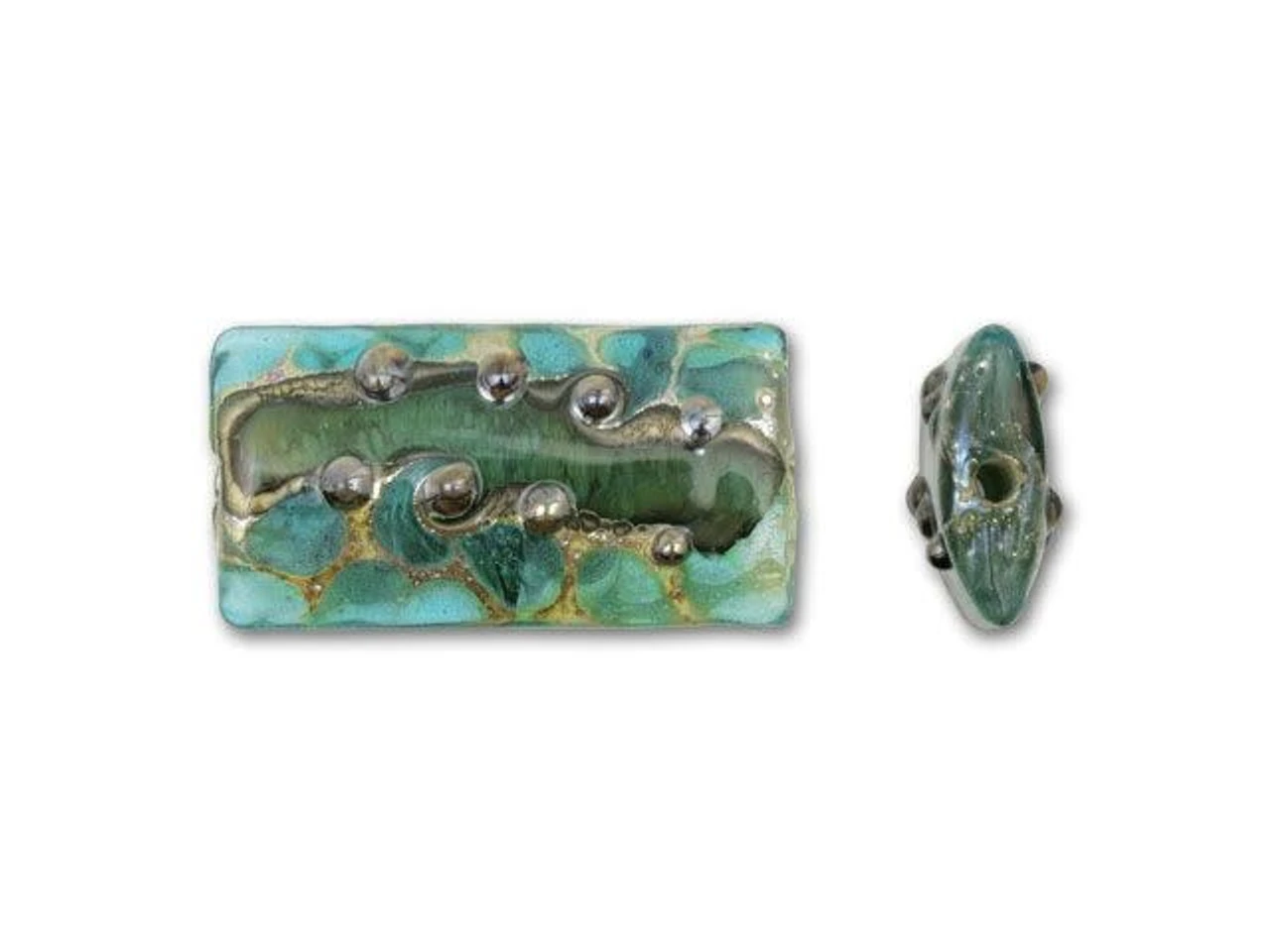 Just looking at this ocean blue lampwork bead will make you think of the surf. It has the aquamarine color of the ocean on a sunny day. Trails of beige run through the sides of this bead the same way that foam forms patterns on retreating waves. The center of the bead features a green and beige line decorated with shiny raised balls.This item is handmade, so appearances may vary. Length 37.5mm, Width 20mm