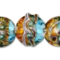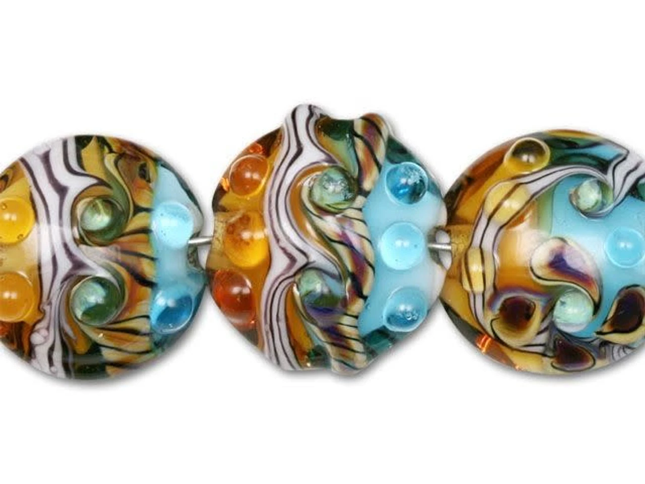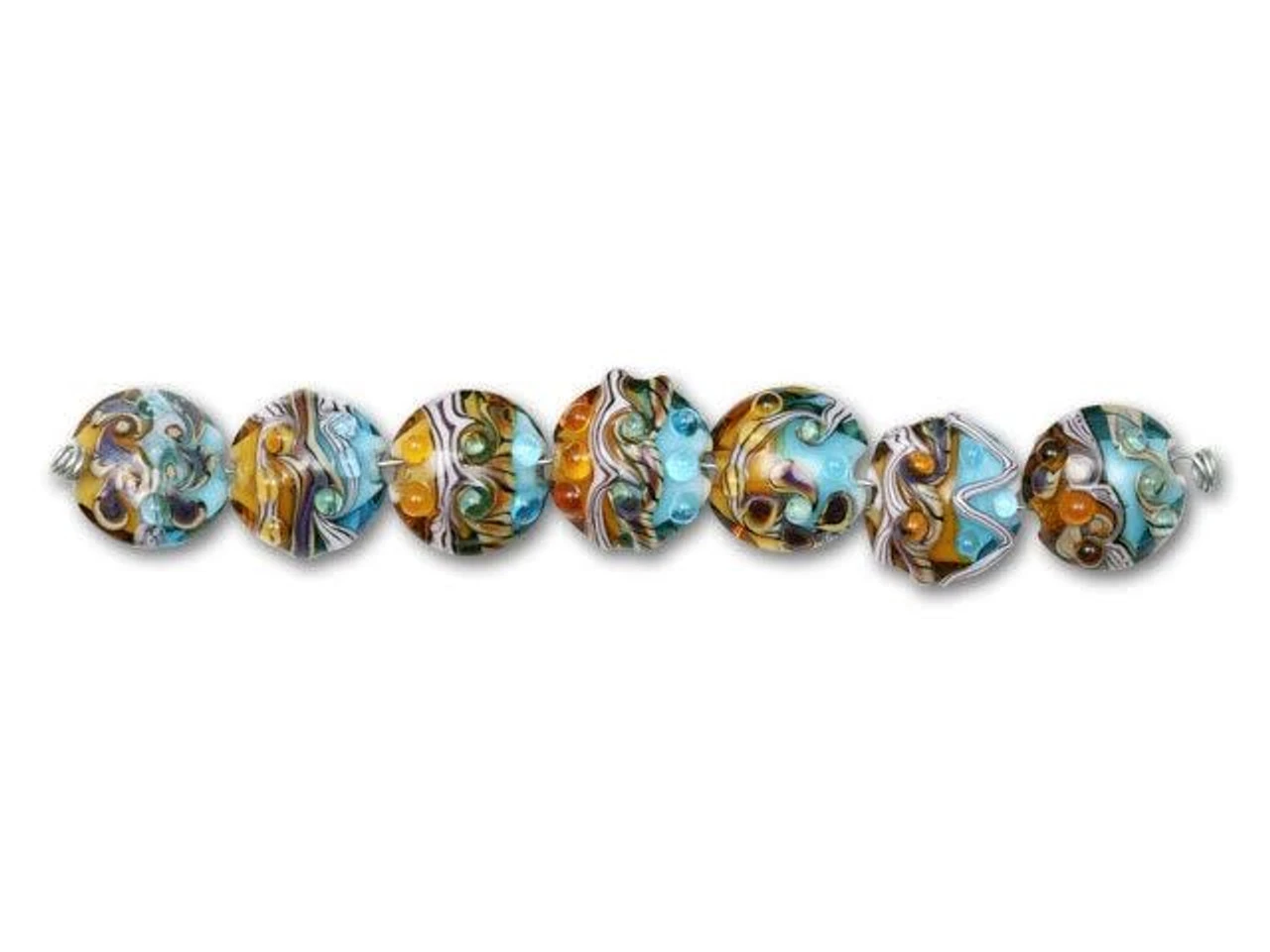 These gorgeous beads will make your designs the focus of attention. They are ideal for earrings, bracelets, and necklaces. Use just one bead on a cell phone finding. Mix them with pearls, gemstone beads, and PRESTIGE Crystal. The intense color of these seven beads simply has to be seen in person. These Grace Lampwork beads feature sunset orange and ocean blue colors, along with swirling designs and a bumpy texture. They are round in shape, perfect for bracelets and necklaces.This item is handmade, so appearances may vary. Length 11.5-13.5mm, Width 14.5mm