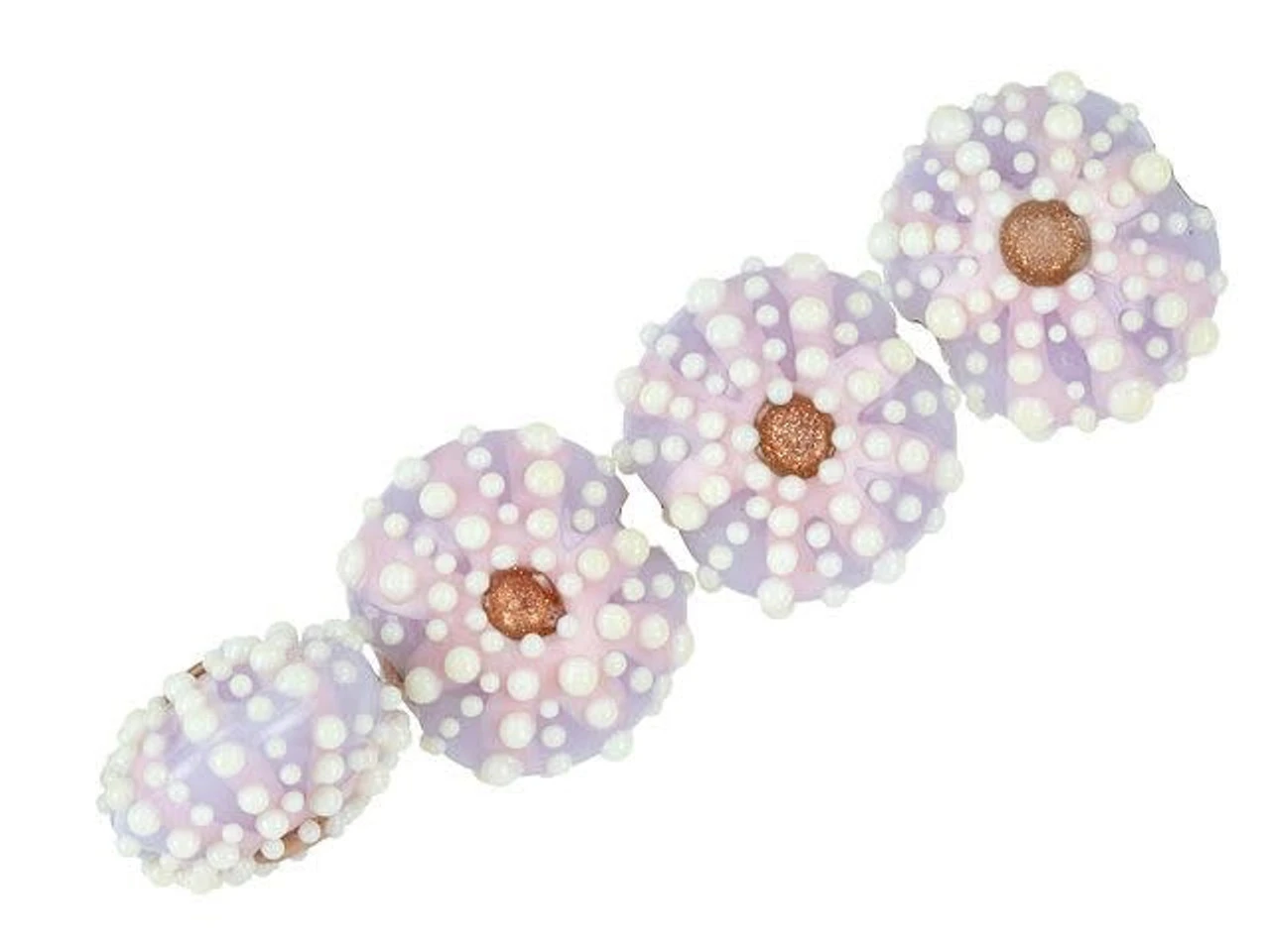 Decorate designs with ocean beauty using these Grace Lampwork beads. These beautiful beads feature a puffed round shape and display a textured sea urchin design. This design is featured on both sides of each bead, so they will look great from every angle. Use them as focal points in bold bracelet designs, add them to earrings, and more. You’ll love the playful purple and pink colors.This item is handmade, so appearances may vary.