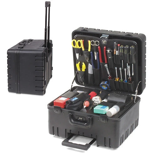 The SP1-SPC35C Fiber Installation Tool Kit comes in a a heavy-duty black polyethylene Roto-Rugged case with an integral luggage cart. It features beefed-up construction, extra-large corners, steel spring-loaded handle and quarter-turn latches.