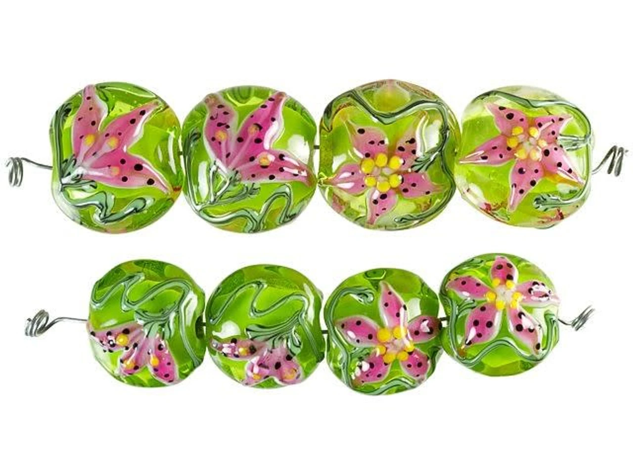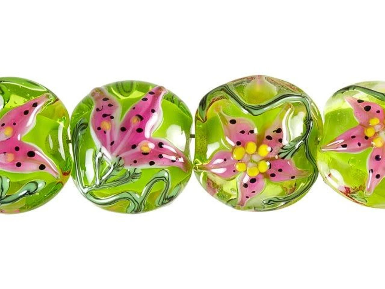 Unique style can be yours with the Grace Lampwork stargazer lily lentil beads. These beads are round in shape and feature a puffed dimension, so they are sure to stand out. Cheerful spring green color fills the glass, while both sides are decorated with a pink flower with black dots and swirling vines. These beads are versatile in size, so you can use them in matching jewelry sets.This item is handmade, so appearances may vary. Length 16-16.5mm, Width 18mm