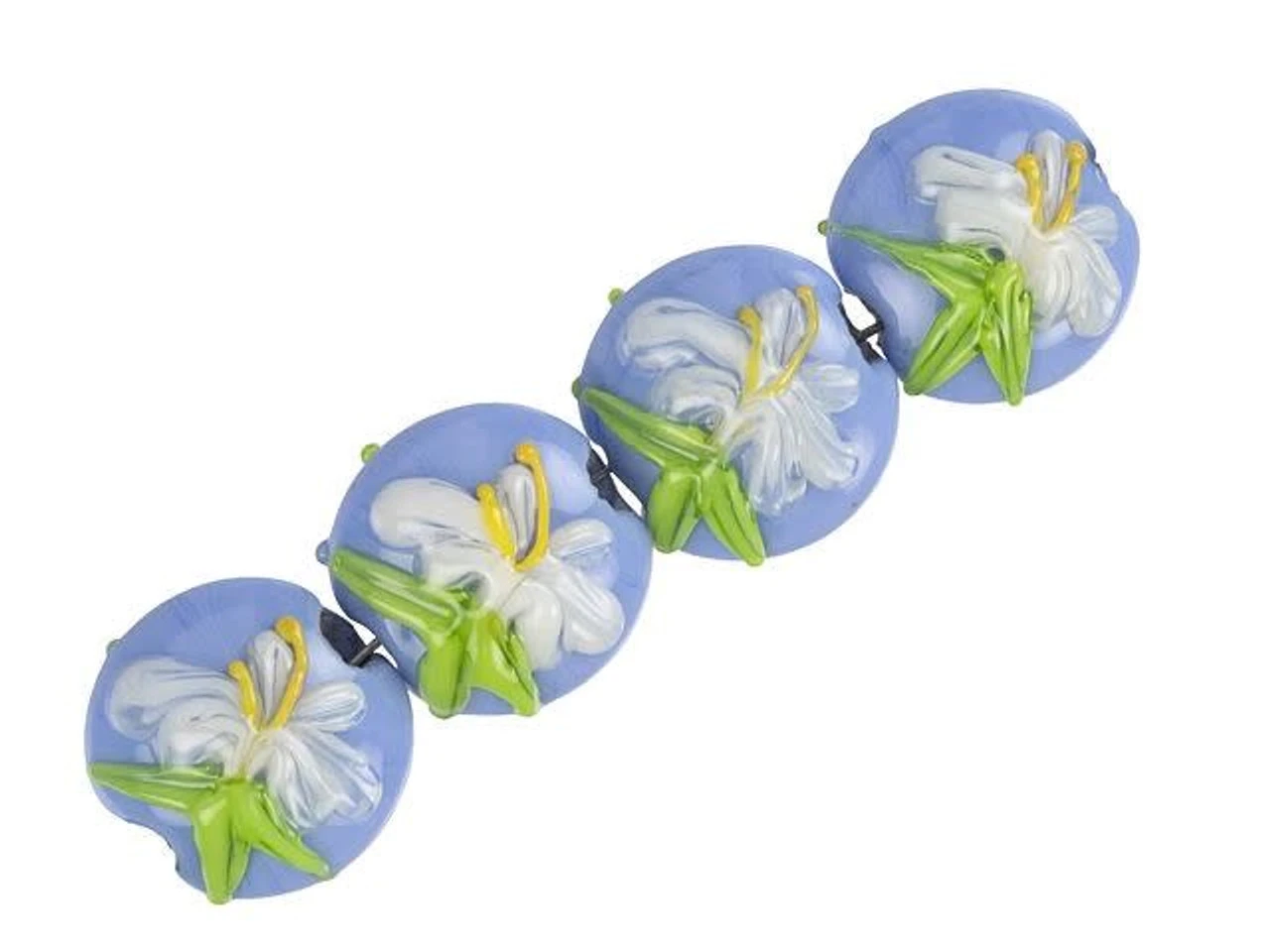 Celebrate floral beauty with these Grace Lampwork beads. These beads are round in shape and feature a slightly puffed dimension. Each bead features a raised design of a white hibiscus flower with green leaves on a light blue background. This design is featured on both sides of each bead, so it will look great from any angle. Use these beads in necklaces, bracelets, or earrings for a lovely tropical look. This item is handmade, so appearances may vary.