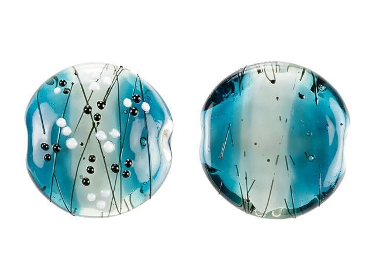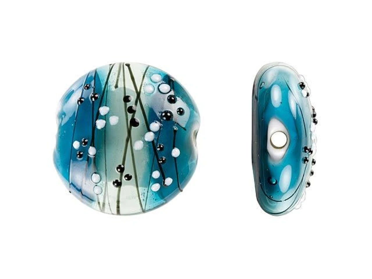 Add artistic style to designs with the Grace Lampwork Windjammer party lentil focal bead. This bead features a circular shape. The front is domed while the back is flat, so it makes an excellent focal. String it onto a head pin to create a pendant or use it at the center of bead embroidery. The front surface is decorated with black lines and small black and white dots. The glass displays teal blue and white color.This item is handmade, so appearances may vary. Length 23.5mm, Width 25mm